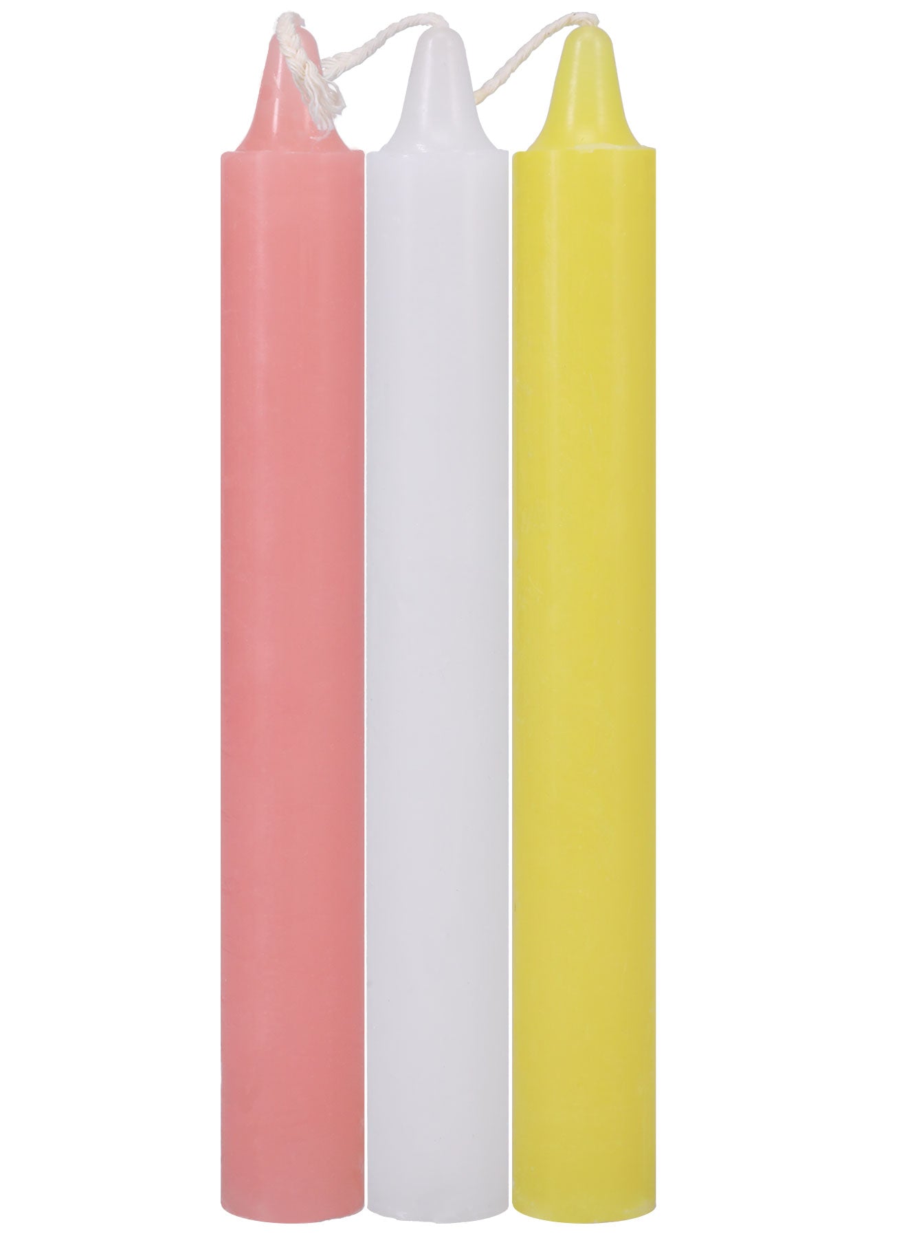 Candles are wonderful for setting the mood, but they're even better for sensation play. These skin-safe Japanese Drip candles' warm drip teases and tantalizes in a way you will never forget. Each three-pack includes a Pink, Yellow, and White candle.